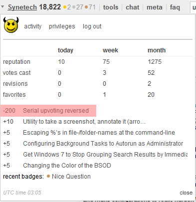 The up-votes ended up getting reversed, and it turns out I wasn’t the only one who got a sudden streak of up-votes, I noticed a couple of others had it, and it was reversed for them as well. I wonder what that was all about and who did it.