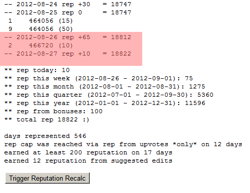 What’s particularly interesting is that whomever did it stopped at 40 upvotes, that’s 200 rep which happens to be the Stack Exchange daily rep-cap, meaning that had they done one more, it would have been recorded, but not applied (i.e., I would not have gotten any more points). What’s particularly odd is that they upvoted only questions which are worth five points as opposed to answers which are worth 10 (which would have meant only 20 upvotes before hitting the cap). I can only deduce that the person who did it is not a novice and is familiar with the Stack Exchange sites, but there is no way to send private messages and the user-facing logging functions are limited, so there is no way for me to know who did it or why.